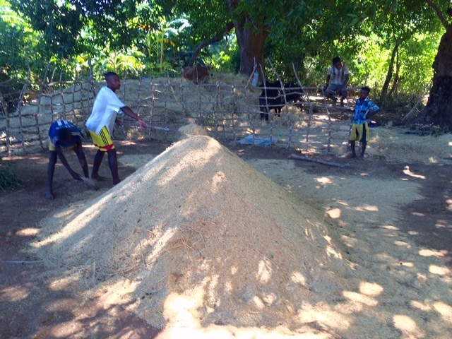 Saturday our village went to help another village process the rice harvest. Here you see the before and after pictures. In between is a lot of hard work!