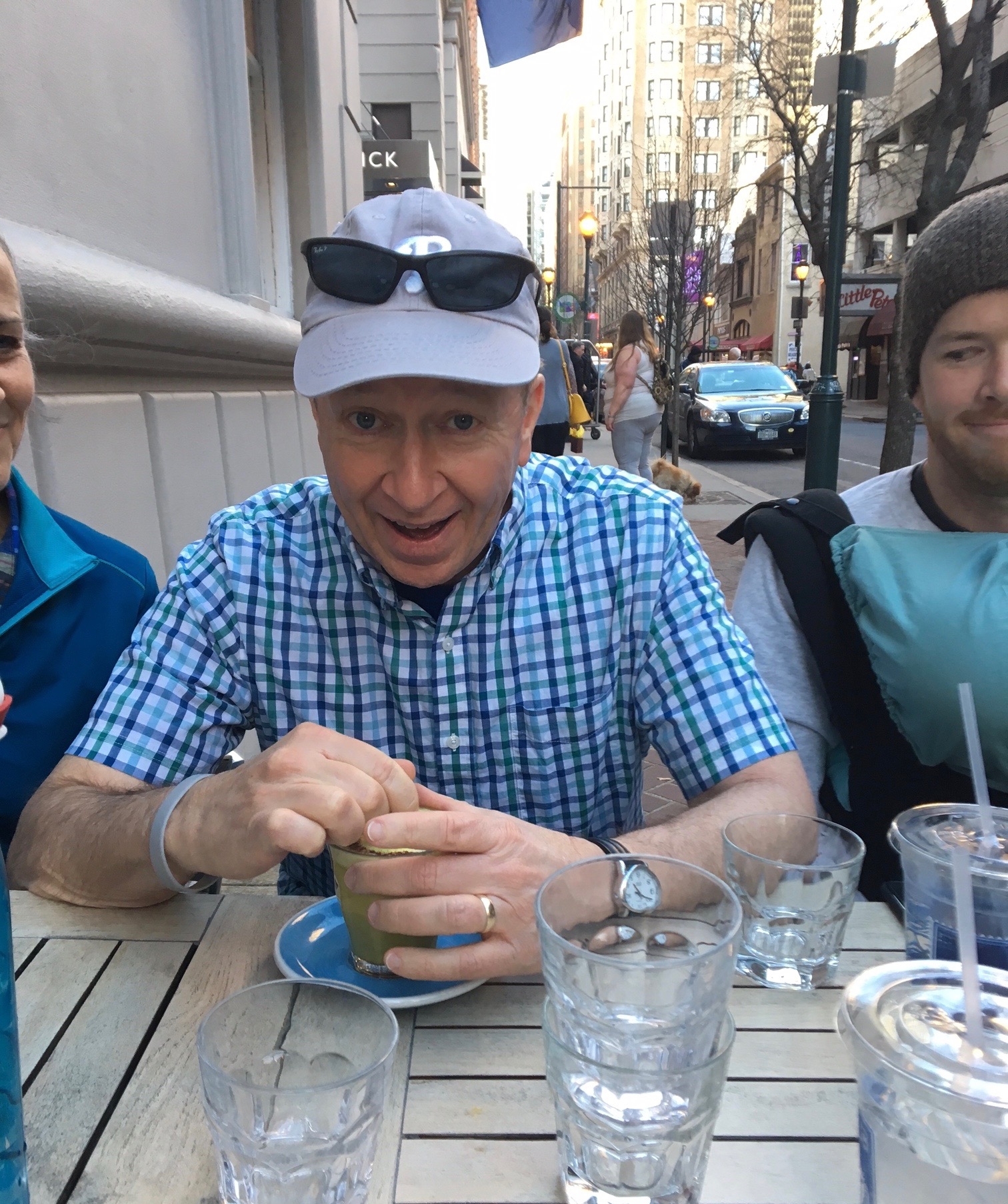 I was just learning how to use my 99-cent phone and thought it was cool to take this kind of picture. (Doesn’t everybody do this now?) Giles Emery taught me at lunch later that day how to hit a button so I didn’t have to take a “blind shot”. Connie and I are on our second phones now, using technology more comfortably.