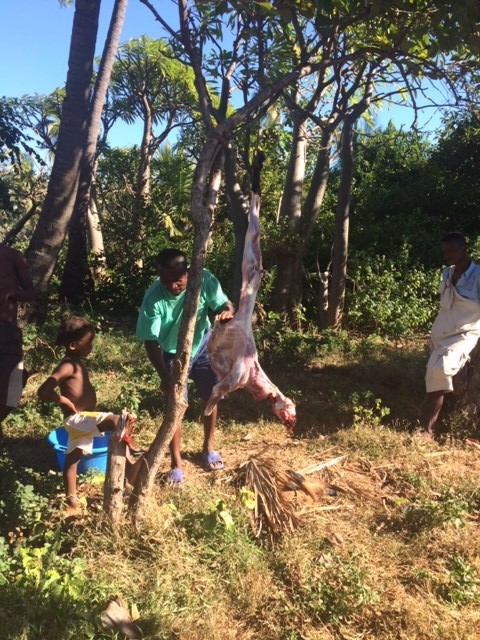 We experienced watching a goat and two chickens get butchered and prepared for the meal. It’s 6:15 AM as I’m writing this and three women from the village are back here washing all the dinner dishes in our front yard. The front yard was also the kitchen for meal preparation.